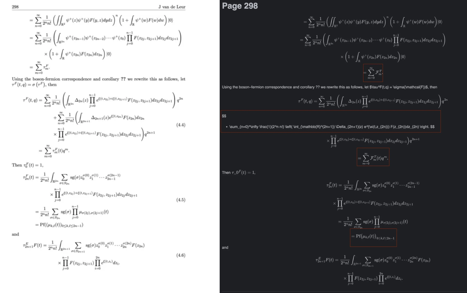 The path from scanned PDF to clean LaTeX isn’t straightforward. A typical math paper might contain dense formulas, inline symbols, proofs split across pages, or references embedded in diagrams. OCR systems can stumble on surprisingly small details: for example, mistaking an F for the Greek letter τ may look like a minor edit-distance error, but it completely changes the meaning of an equation.