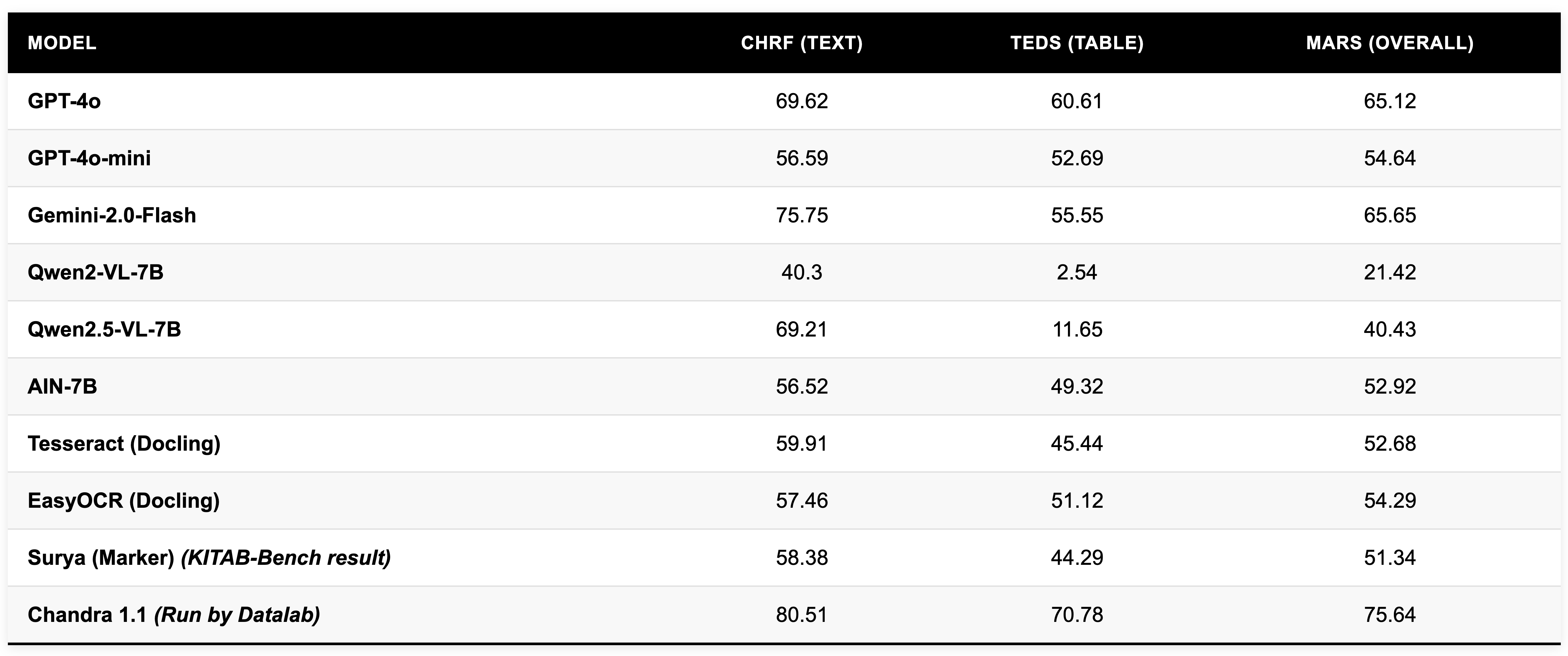 We also lead KITAB-Bench, an Arabic text benchmark, by a wide margin. Note that many of these models are outdated since we pulled results directly from the KITAB-Bench repo.