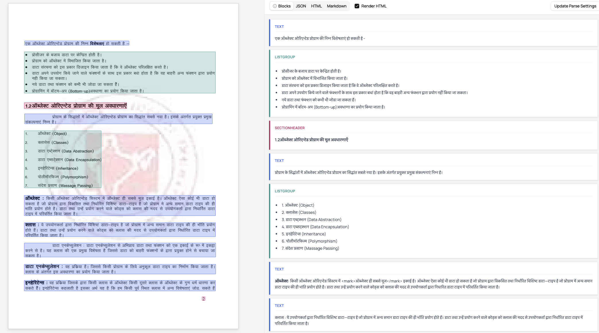 This example demonstrates Datalab’s ability to parse and structure Hindi-based pdfs. The outputs accurately distinguish section headers, lists, and text blocks, organizing them into labeled “Blocks” derived from Datalab’s JSON output. Each block is tagged with its type — such as LISTGROUP, SECTIONHEADER, or TEXT — allowing downstream systems to reconstruct or analyze document structure programmatically.