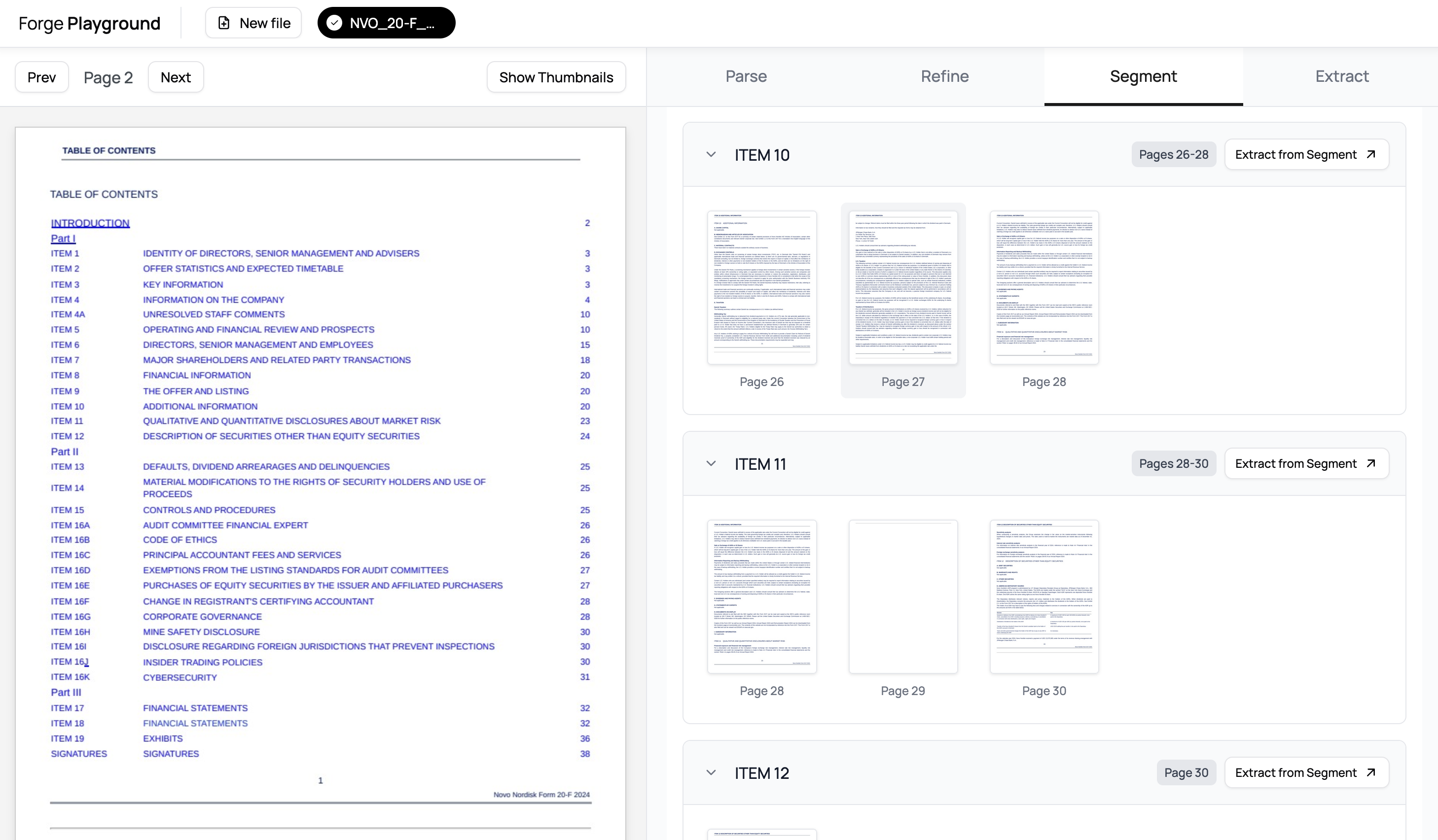 In this case, we found an SEC filing from Novo Nordisk and used Datalab’s auto-segmentation feature to automatically group a 46 page file into 32 different segments, each inferred from the table of contents.